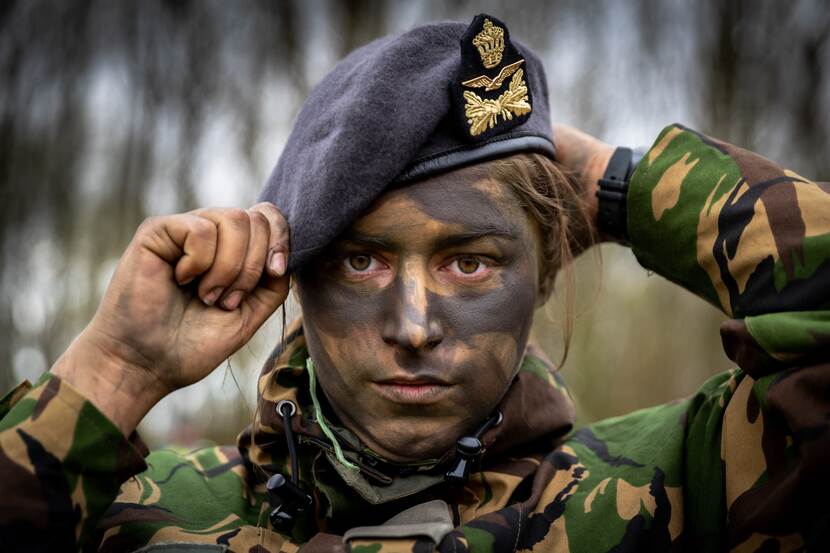 Met trots zet een pasgeworden luchtmachter haar baret op. Samen met 68 collega-aspiranten rondde zij onlangs de Algemene Militaire Opleiding af. Sluitstuk was een uitputtende eindoefening die eindigde bij de poort van Vliegbasis Woensdrecht. Hier werden de militairen verwelkomd door medewerkers van de basis, maar helaas niet door vrienden en familie. Die konden er vanwege corona niet bij zijn. De leuke plaat is van sergeant Cristian Schrik.