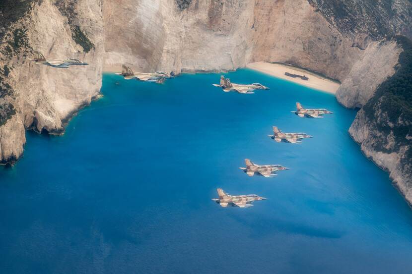Interessant voor liefhebbers van zowel Griekenland als de militaire luchtvaart is deze foto van zeven Israëlische F-15’s en F-16’s boven Navagio Beach op het eiland Zakynthos. De Israëli’s waren in Griekenland te gast voor de oefening Iniohos 2021, waaraan ook de Verenigde Arabische Emiraten, de Verenigde Staten, Cyprus, Frankrijk, Spanje en Canada meededen. De foto is afkomstig van de Israëlische luchtstrijdkrachten.