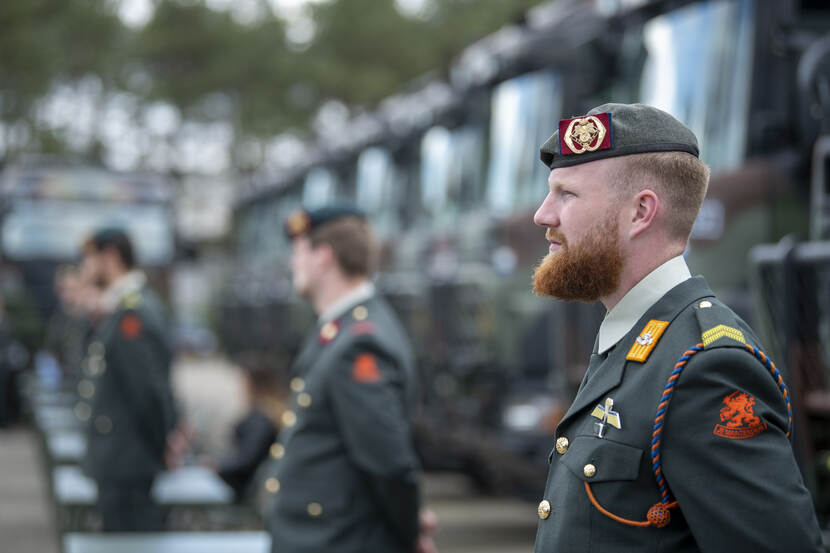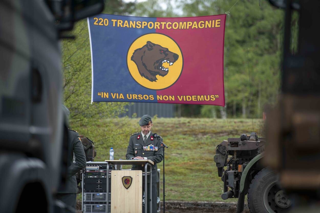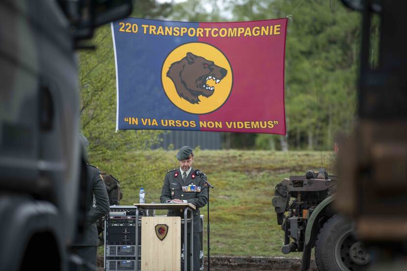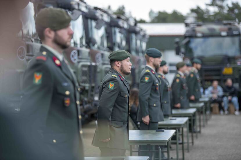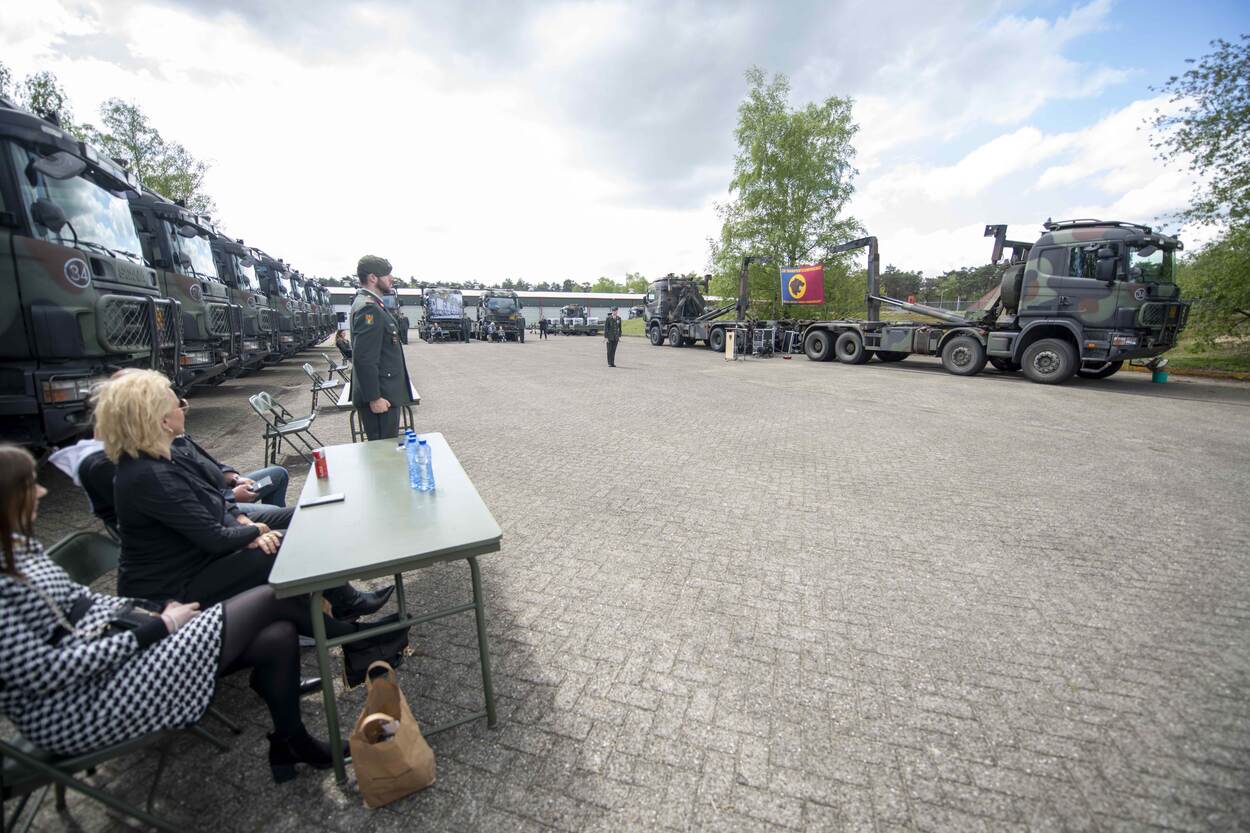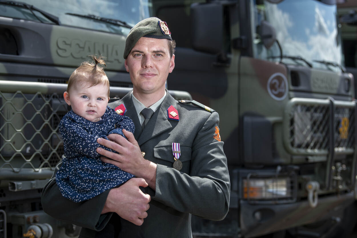 Omgeven door zestien Scania’s op een plein, vergezeld door familie en vrienden, staan de militairen in de lentezon. Het is een bijzondere medaille-uitreiking: na een militaire groet van de commandant van 220 Transportcompagnie majoor Roelof Posthouwer (43) mogen de militairen zélf hun onderscheiding opspelden.