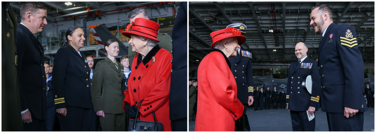 Op de valreep kregen de mannen en vrouwen van Carrier Strike Group 21 nog hoog bezoek. Nadat eerst de Britse minister-president Boris Johnson langs kwam in Portsmouth, landde zaterdag de Britse koningin Elizabeth met een helikopter op het vliegdek van de HMS Queen Elizabeth. Tijdens een rondgang over het reusachtige schip (66.000 ton) sprak de 95-jarige vorstin met personeel en liet zich informeren over het aanstaande avontuur. Nadat de Queen was uitgezwaaid was iedereen klaar voor vertrek en verlieten de schepen de haven van Portsmouth.