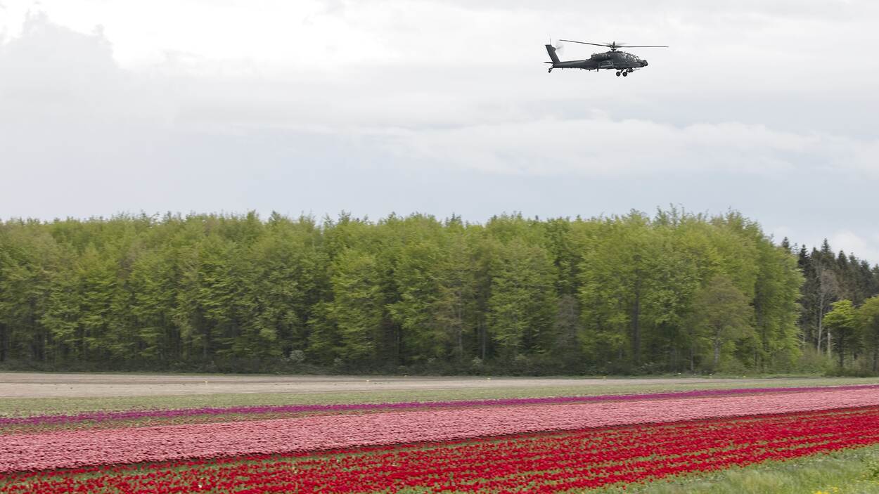 Arno Gravemaker was er als de kippen bij om de Apache gevechtshelikopter vast te leggen terwijl die boven de kleurrijke bloembollenvelden bij Biddinghuizen vloog. Een foto vol contrasten: fleurige bloembollen, groene bomen, een grijze lucht en een matgroen gecamoufleerde helikopter. Prima plaat dus!
