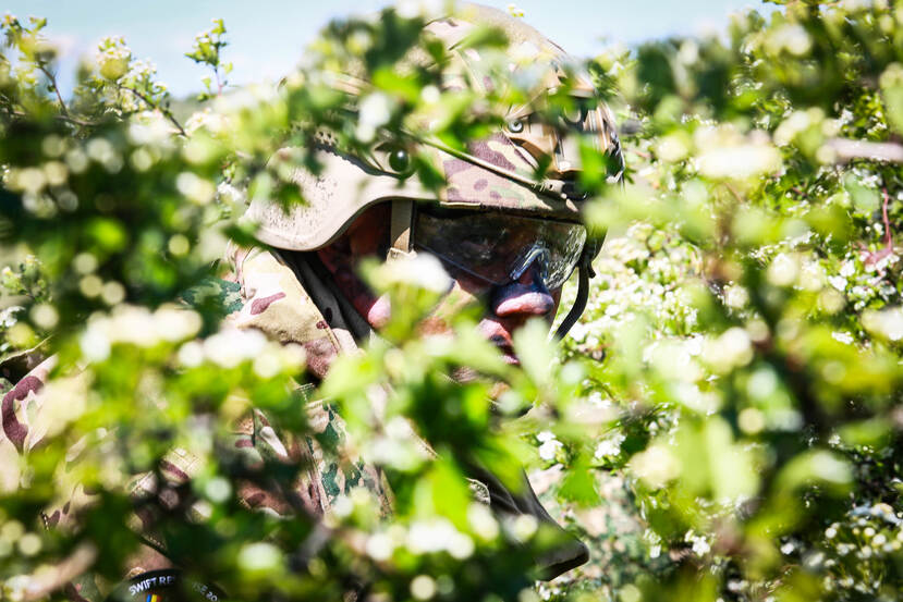 De fotograaf die deze foto maakte, sergeant Audrequez Evans van de Amerikaanse landmacht, herkende in deze foto heel duidelijk een militair van onze luchtmobiele brigade. Maar of dat écht zo is? Uw redacteur kan het niet goed zien dankzij het uitstekende camouflagewerk. De foto werd gemaakt in Roemenië bij oefening Swift Response 21.