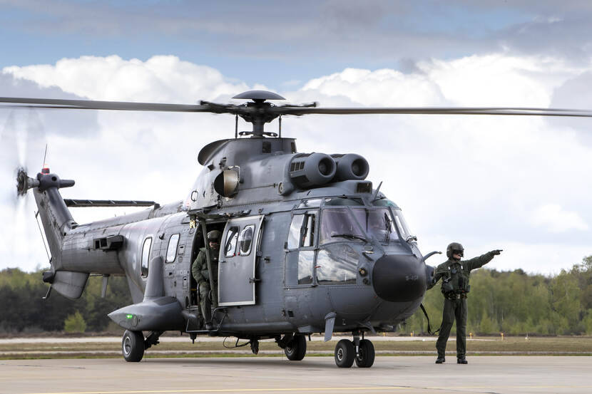 Een opmerkelijke foto van sergeant-majoor Gerben van Es want het lijkt net of de vlieger van deze Cougar van de luchtmacht de weg vraagt aan zijn collega. En die lijkt te weten hoe de Cougar het beste kan taxiën of vliegen. Niets is minder waar. Het is gewoon een gesprek tussen collega's op het platform van Vliegbasis Gilze-Rijen.