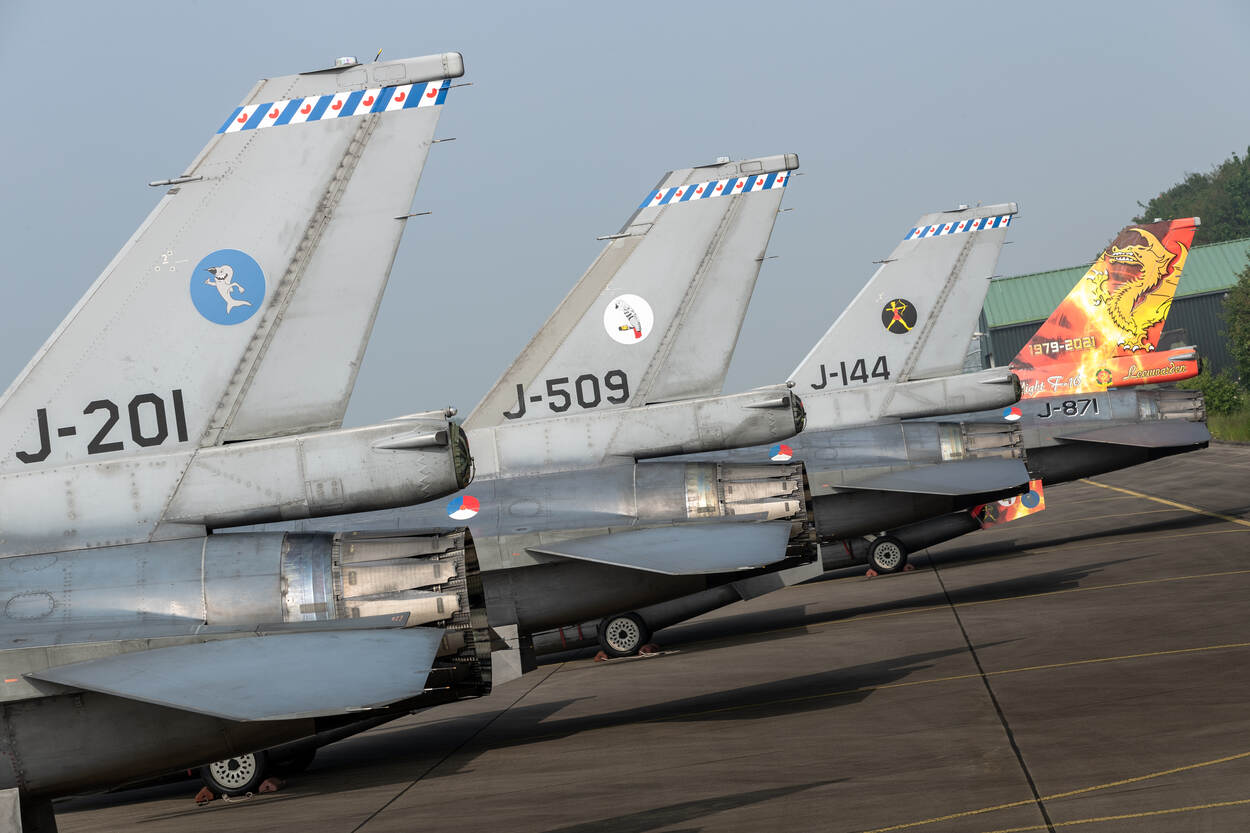 Sergeant-1 Cristian Schrik legde deze F-16’s in historische kleuren en bestickering vast, net voordat ze afscheid zouden nemen van hun thuisbasis Leeuwarden. Door de komst van steeds meer F-35 Lightning II gevechtsvliegtuigen vinden F-16 operaties per 1 juli vanaf vliegbasis Volkel plaats.