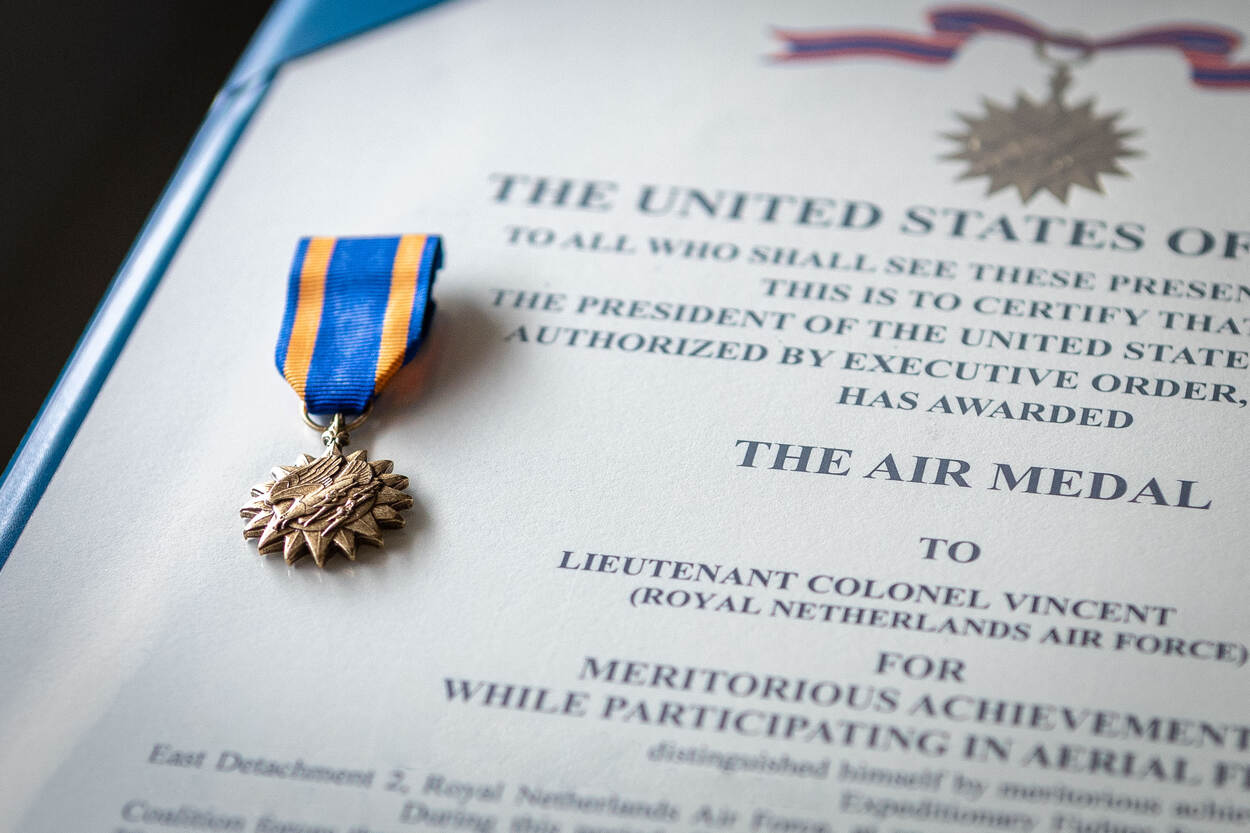 Korporaal Gregory Frény maakte deze mooie compositie van één van de Air Medals, die onlangs aan Nederlandse F-16 vliegers werden uitgereikt. Zij kregen de hoge Amerikaanse onderscheiding vanwege hun inzet in de strijd tegen IS in Irak en Syrië.