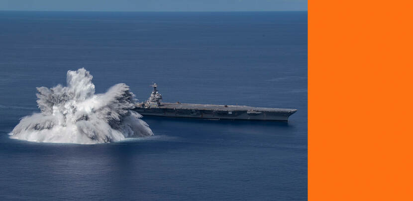De Amerikaanse marine heeft bij vliegkampschip Gerald R. Ford een grote hoeveelheid explosieven tot ontploffing gebracht. De test werd gedaan om te onderzoeken hoe kwetsbaar het schip is bij een aanval. De ontploffing was vergelijkbaar met een aardbeving met een kracht van 3.9 op de schaal van Richter.