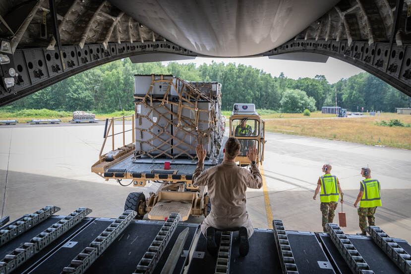 Zodra de achterklep van de C-17 naar beneden gaat, ontvouwt zich een bliksemoperatie. De crew spurt naar buiten. Een Scania met wissellaadsysteem komt meteen aangereden. Van den Berge en zijn collega’s loodsen de vrachtwagen moeiteloos naar binnen.