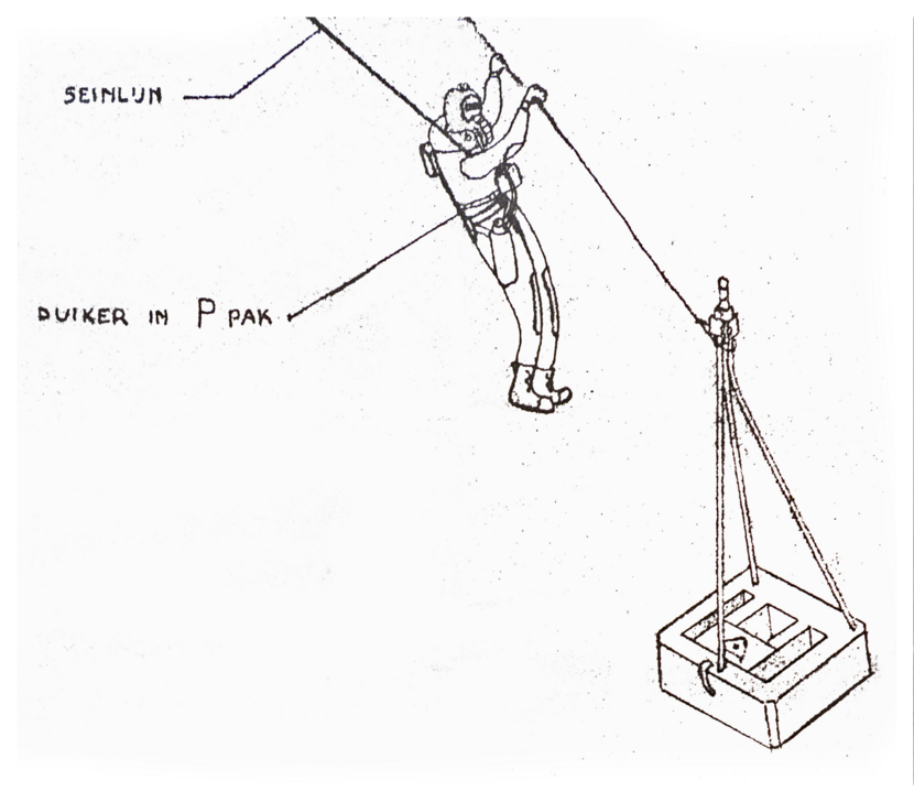 Maar eenvoudig was dat door de sterke stroming in de Westerschelde niet. “Soms moesten de duikers zich achter die bakken verschuilen om uit de stroming te blijven. We moesten zogezegd op hoog en laag water wachten. Als de stroming onder een knoop zat, deden we een poging.”