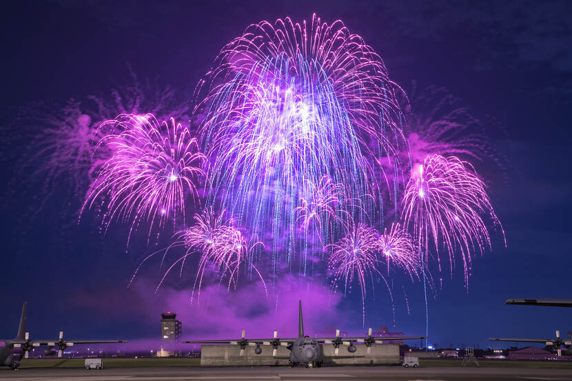 Vuurwerk explodeert achter een C-130J Super Hercules op Yokota Air Base in Japan. De kleurrijke show vormt het hoogtepunt van de Celebrate America viering. Dit lokale, jaarlijkse evenement biedt militairen en hun familie de gelegenheid met elkaar Independence Day te vieren. Sport, spel, muziek en een mooi vuurwerk zijn de voornaamste ingrediënten. De foto is van Senior Airman Brieana E. Bolfing.