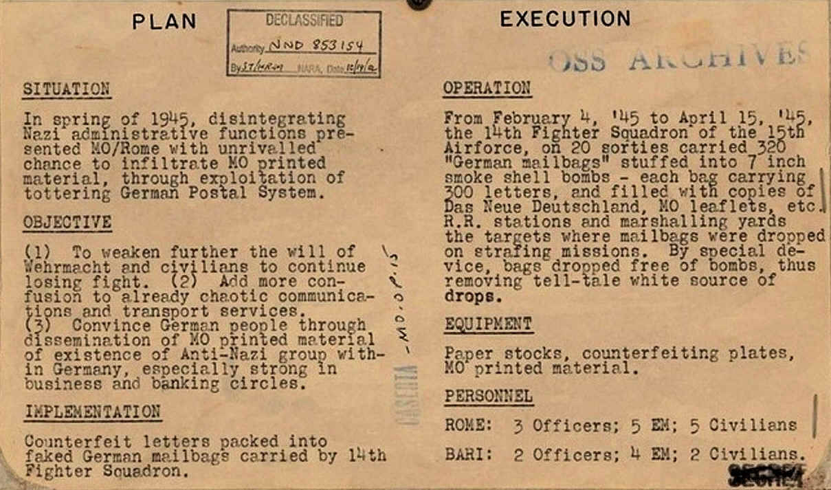 Het zijn acties die hebben plaatsgehad in het laatste jaar van de Tweede Wereldoorlog. The Office of Strategic Services (OSS), de voorloper van de CIA, kwam begin 1945 met een plan om via brieven vol nepnieuws, vervalste- én fantasiepostzegels de Duitse en Italiaanse thuisblijvers te demotiveren. Of liever nog: in opstand te komen tegen de dictators Adolf Hitler en Benito Mussolini.