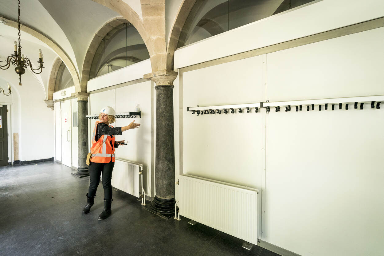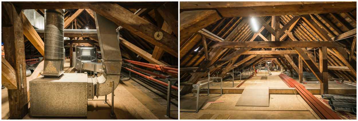 De rondleiding over de ‘bouwput’ begint op de zolder waar van oudsher de technische ruimtes zijn ondergebracht. “Dat blijft ook na de renovatie zo”, benadrukt Van Rijnsbergen. “Al wordt het heringericht en vernieuwd met onder meer een watermist-sprinklerinstallatie, ventilatieleidingwerk, elektra, ICT en een warmtewisselaar.