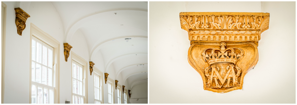 In de hal op de eerste verdieping dragen houten consoles uit de zeventiende eeuw de initialen W en M. Wat staat voor William en Mary. William is stadhouder Willem III die door zijn huwelijk met Mary II in 1689 koning van Engeland en Schotland werd. Sommige van deze houtsnijwerken zijn beschimmeld, gescheurd of op een andere manier aangetast. “We laten ze nu actief conserveren, zodat ze hersteld en beschermd worden en daardoor weer lang meekunnen. Volledig restaureren doen we niet, dat bleek helaas te kostbaar.”
