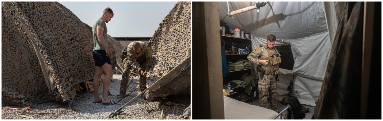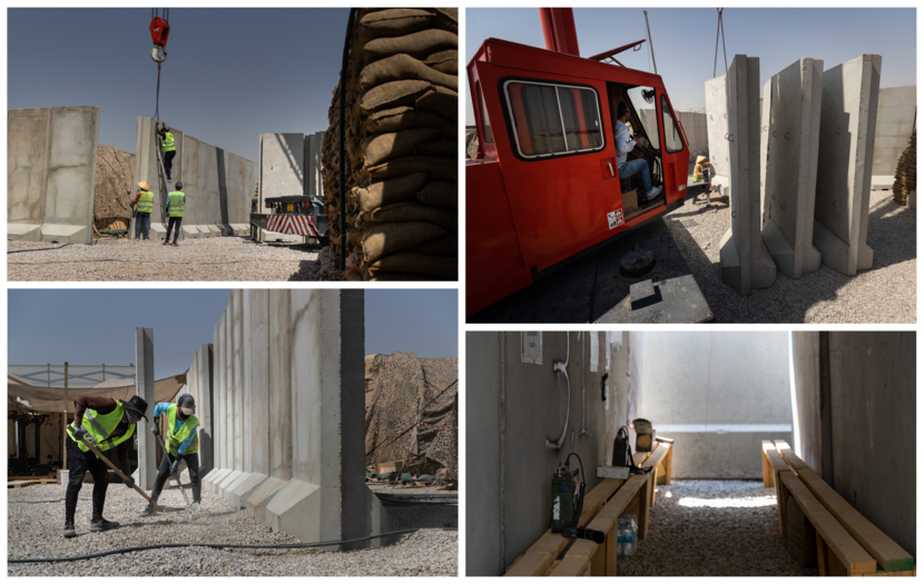 Het landschap wordt gekenmerkt door zand, steen en stof. Voorheen was de basis een relatief open vlakte, maar inmiddels blokkeren metershoge muren het zicht. “Er wordt gecompartimenteerd”, legt de squadroncommandant uit. Het terrein moet zijn opgedeeld, zodat een eventuele inslag beperkt blijft tot een klein gebied.