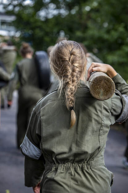 En vervolgens werd nog een konijn uit de hoge hoed getoverd: toen na de mars de attributen ingeleverd moesten worden, kregen de psychologen van het Dienstencentrum Personeelslogistiek ineens een brancard met tachtig kilo gewicht. “Daar moesten we ook nog een stuk mee marsen. Knak”, reageert de 29-jarige selectiepsycholoog Carola.