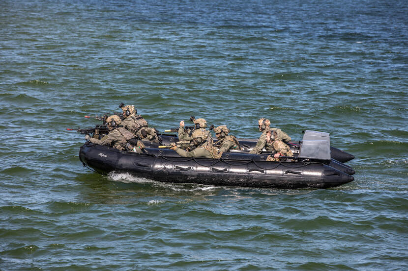 Alle deelnemers moeten hun trainingsdoelstellingen halen en daarvoor zijn faciliteiten nodig. Veel faciliteiten. Alleen al de hoeveelheid materieel die alle deelnemende landen meebrengen is indrukwekkend: marineschepen, snelle Rigid Hull Inflatable Boats en zo’n 29 helikopters, straaljagers en transportvliegtuigen. Het ontbreekt aan niets en daar plukken onder meer de Nederlandse SOF-eenheden de vruchten van: het Korps Commandotroepen (KCT) en de Netherlands Maritime Special Operations Forces (NLMARSOF). “Met al deze middelen kunnen we veel meer facetten trainen dan in een Nederlandse oefensetting”, vertelt plaatsvervangend compagniescommandant Bas* van het KCT. (*De achternaam van Bas is weggelaten uit veiligheidsoverwegingen).