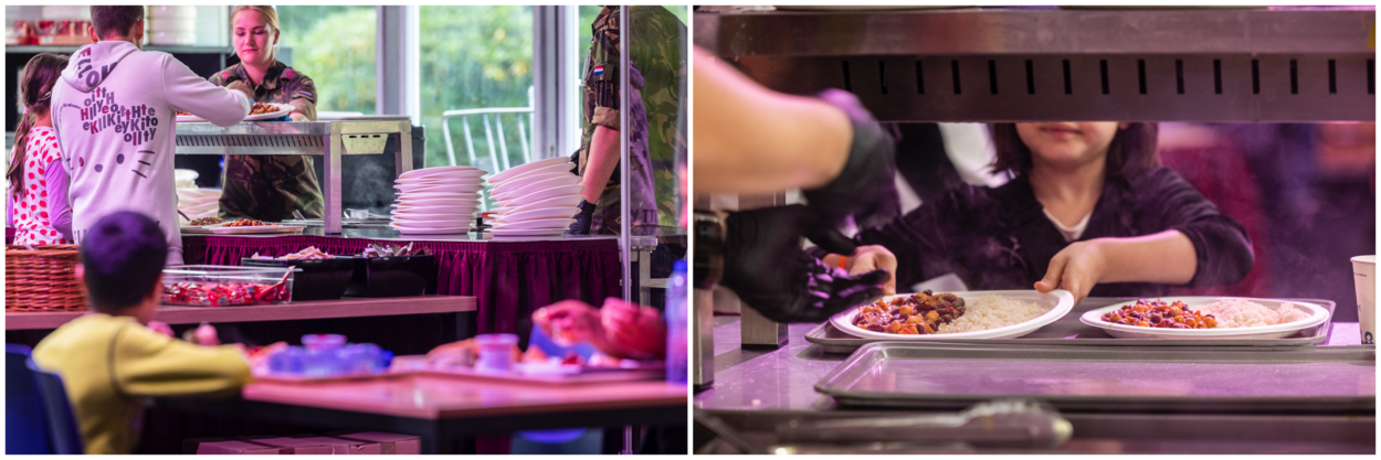 Op dagelijkse basis werken op Camp New Amsterdam zo’n 18 cateringmedewerkers. Met de komst van de evacués zijn er twee keer zoveel handjes nodig. In de keuken bij de bereiding, aan de voorkant bij het uitserveren. Doordat het Walaardt Sacré Kamp niet over een eigen keuken beschikt, moeten er dagelijks maaltijden heen en weer gereden worden vanuit het bedrijfsrestaurant in Camp New Amsterdam.