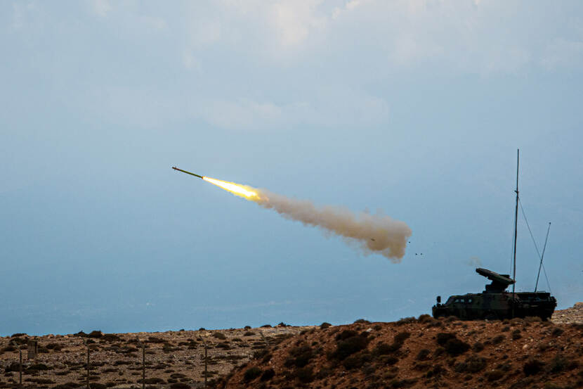 Een luchtaanval! Maar gelukkig is het Defensie Grondgebonden Luchtverdedigingscommando paraat en binnen seconden snelt een AMRAAM-raket op zijn doel af. Tijdens een schietoefening op het Griekse eiland Kreta schoot het DGLC zowel met de Patriot, AMRAAM als Stinger. Foto: DGLC.