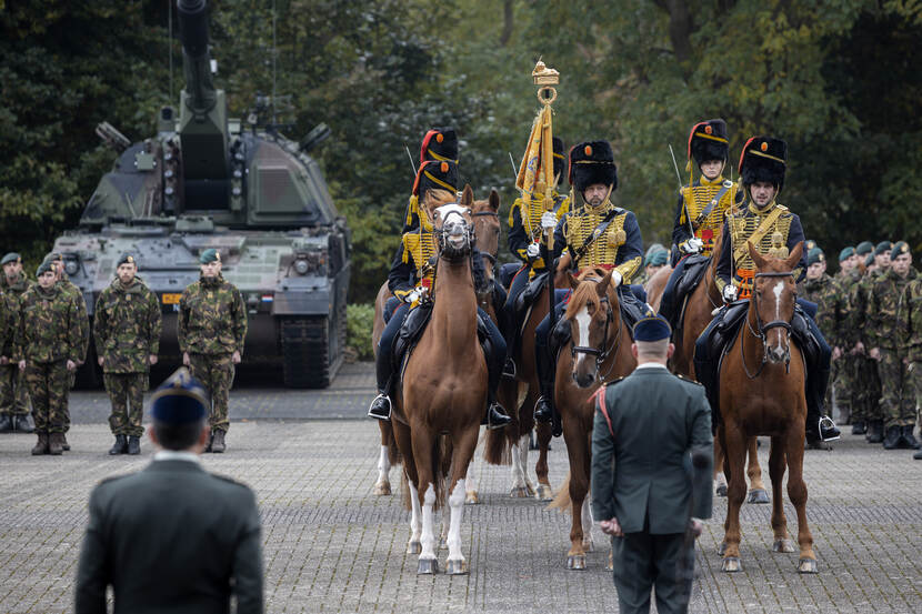 Kapitein Van der Griendt stuurde deze bijzondere foto van de recente commando-overdracht van 41 Afdeling Artillerie en het Korps Rijdende Artillerie in ’t Harde. Te zien is dat de bereden standaardwacht van het Korps Rijdende Artillerie zich meldt bij de paradecommandant.