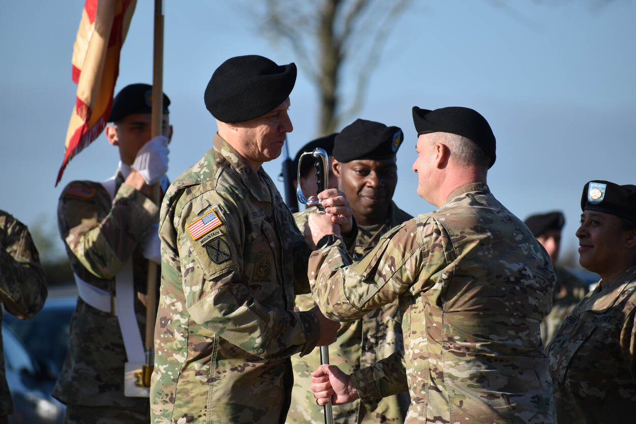 Sergeant-majoor Gary E. Yurgans (links) accepteerde onlangs op Chièvres Air Base in België de functie van command sergeant-major over het US Army Garrison Benelux (militaire basis).Garnizoenscommandant kolonel James Yastrzemsky droeg het zwaard over aan Yurgans. De foto is van Bryan Gatchell.