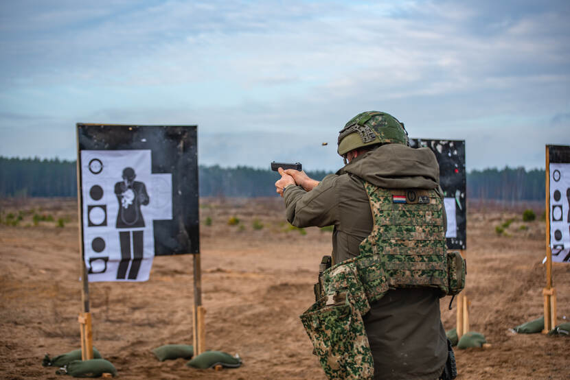 Militairen van 43 Gemechaniseerde Brigade werken regelmatig aan hun schietvaardigheid met het persoonlijk wapen 5.56 mm Colt en met het dienstpistool 9 mm Glock. Meestal vinden deze sessies plaats tijdens grote oefeningen van enhanced Forward Presence Battlegroup Litouwen. Foto is van korporaal Wessel.