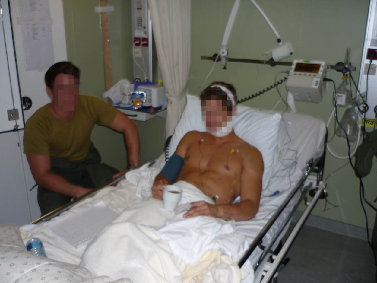 Zodra de boarding erop zit, wordt de versufte Frank voor een medische behandeling overgebracht naar de ziekenboeg van de Tromp. “Bij mij was het licht intussen uitgegaan. Pas toen de verplegers een tekening lieten zien van een poppetje dat van een container op een boot viel, kreeg ik in de gaten wat er was gebeurd. Ondanks alles wilde ik mijn tijd op de Tromp afmaken, maar dat mocht niet. Via de medische afvoerketen werd ik naar Nederland gerepatrieerd.”
