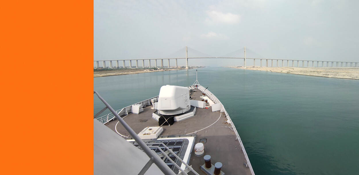 HMS Queen Elizabeth is op de terugreis naar Groot-Brittannië, na een vaartocht richting het Verre Oosten. Juist deze week passeerden de deelnemende schepen, waaronder ook het Nederlandse fregat Zr.Ms. Evertsen, het Suezkanaal (zie foto). De Evertsen wordt op 5 december terugverwacht in Den Helder.