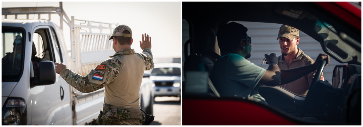Terug naar de hoofdingang. Wie z’n toegangsbewijs niet laat zien (‘Wear your badge’) of stampij maakt, wordt verzocht even te wachten. Zoals twee Canadese dames wier toegangspassen zijn verlopen. De Nederlanders bellen collega's in patrouillewagens van de SECFOR: Security Force. Die rijdt 24 uur per dag over de basis en kijkt uit naar afwijkende zaken. Opvolgend pelotonscommandant wachtmeester-1 Marc krijgt de melding en is binnen een paar minuten ter plaatse om de dames dringend te verzoeken een nieuwe pas aan te vragen.