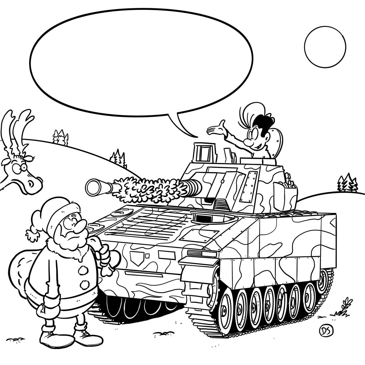 Degenen die deze stripkleurplaat het mooiste inkleuren én er een originele tekst bij verzinnen, maken kans op mooie prijzen! Want het Nationaal Militair Museum in Soesterberg geeft toegangsbewijzen weg voor maar liefst vier gezinnen! Extra leuk voor in de kerstvakantie, want het museum heeft tal van speciale activiteiten gepland.