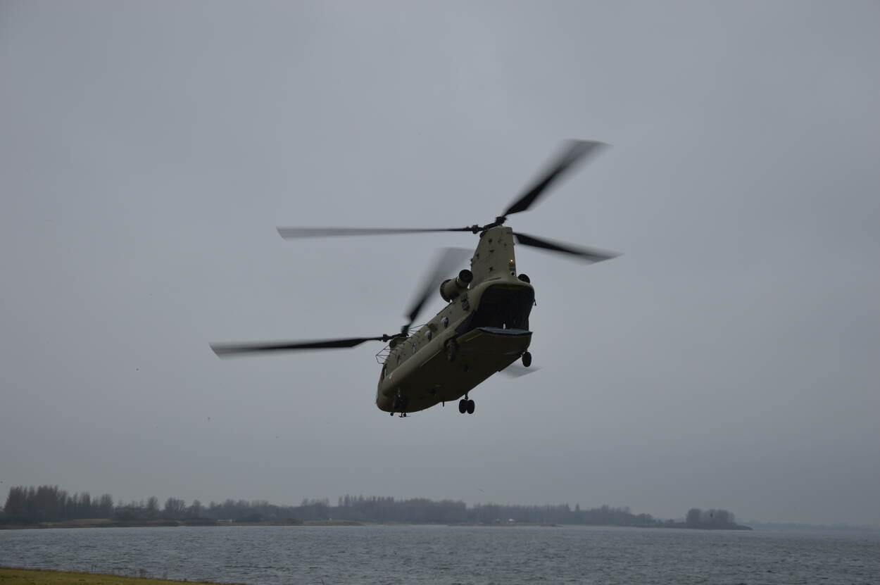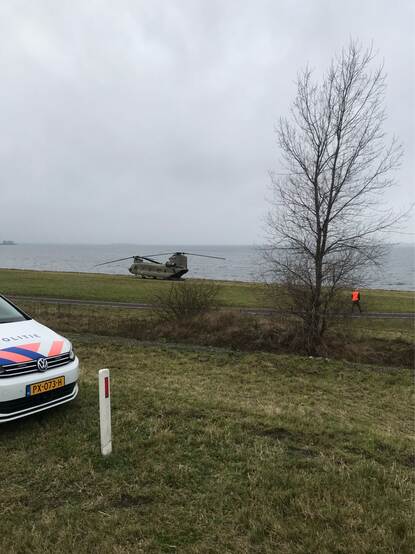 Op de langgerekte dijk en op gepaste afstand landt de Chinook. Eenmaal op de grond stuiven de loadmasters en TD’er de kist uit om te helpen. Na het uitzetten van de heli sluiten de vlieger en de copiloot aan. "Het is hulp uit zeer onverwachte hoek", aldus weginspecteur Mark Bakelaar, die de vliegers vanaf de grond om hulp wenkte.
