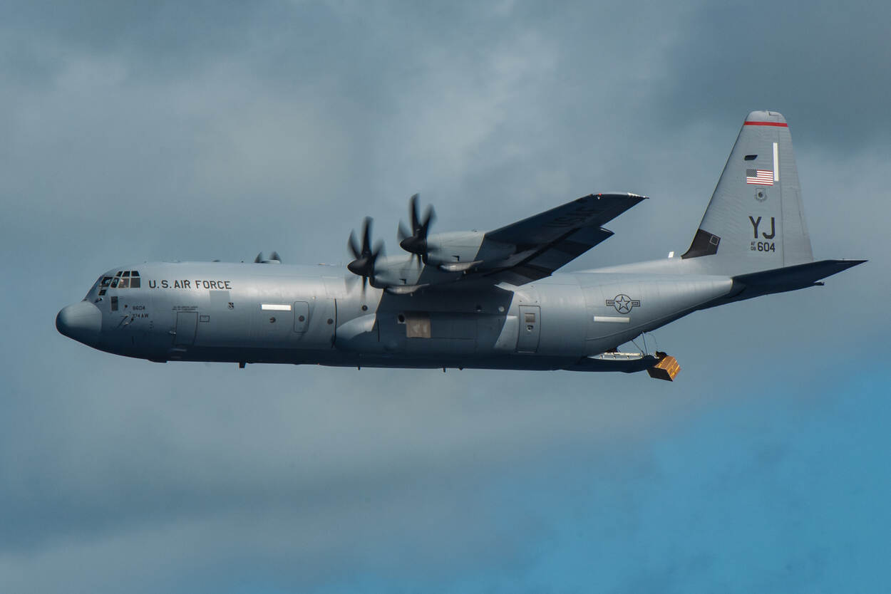 Daar gaat-ie! Op deze foto uit 2019 wordt een ‘Low-Cost, Low-Altitude’ lading uit de Hercules geduwd. Even later gaan de parachutes open en landt het pakket op een afgelegen eiland in Oceanië. Of, als dat niet kan, in zee vlak bij de kust. Foto: Staff Sergeant Kyle Johnson.