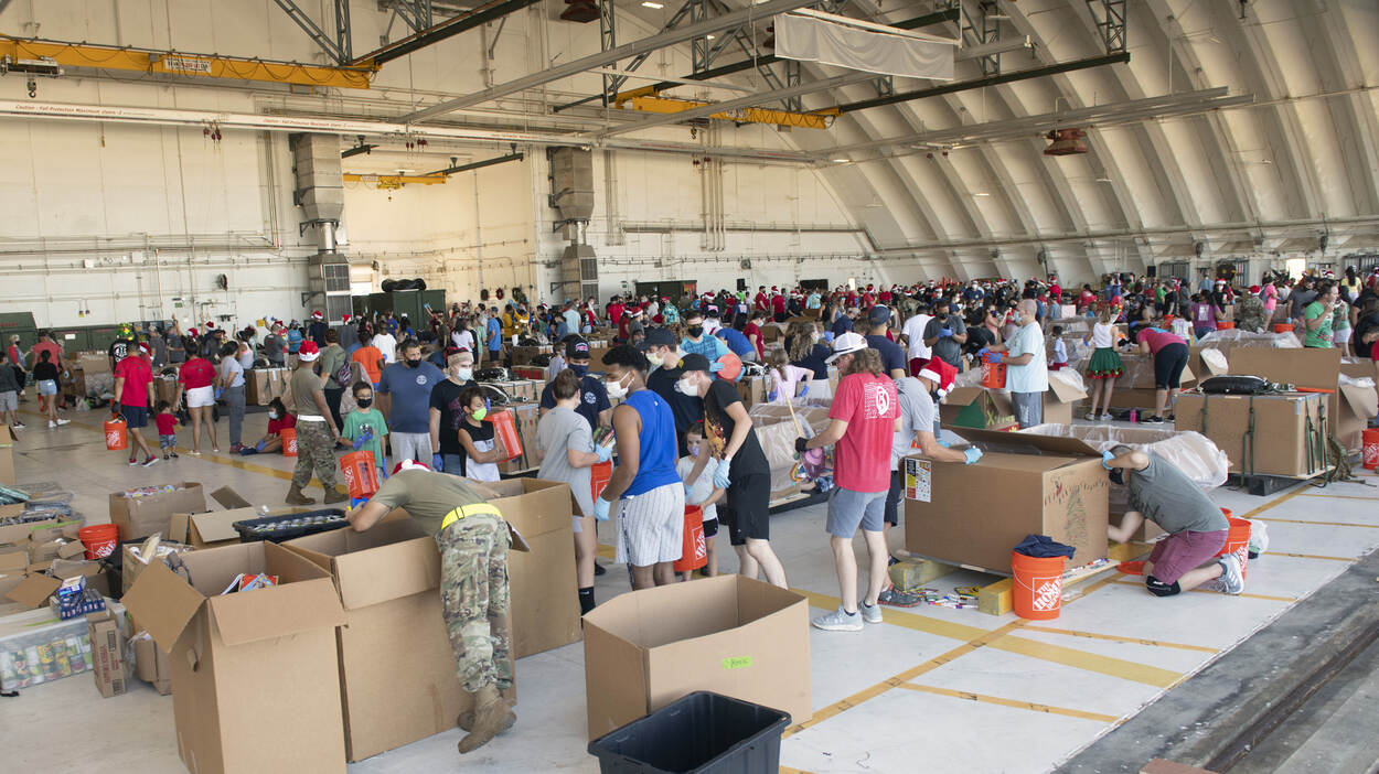 Het begint ieder jaar met het inpakken van dozen vol hulpgoederen. Dat gebeurt op Anderson Air Force Base in Guam door vele tientallen vrijwilligers. Foto: Technical Sergeant Joshua Edwards.