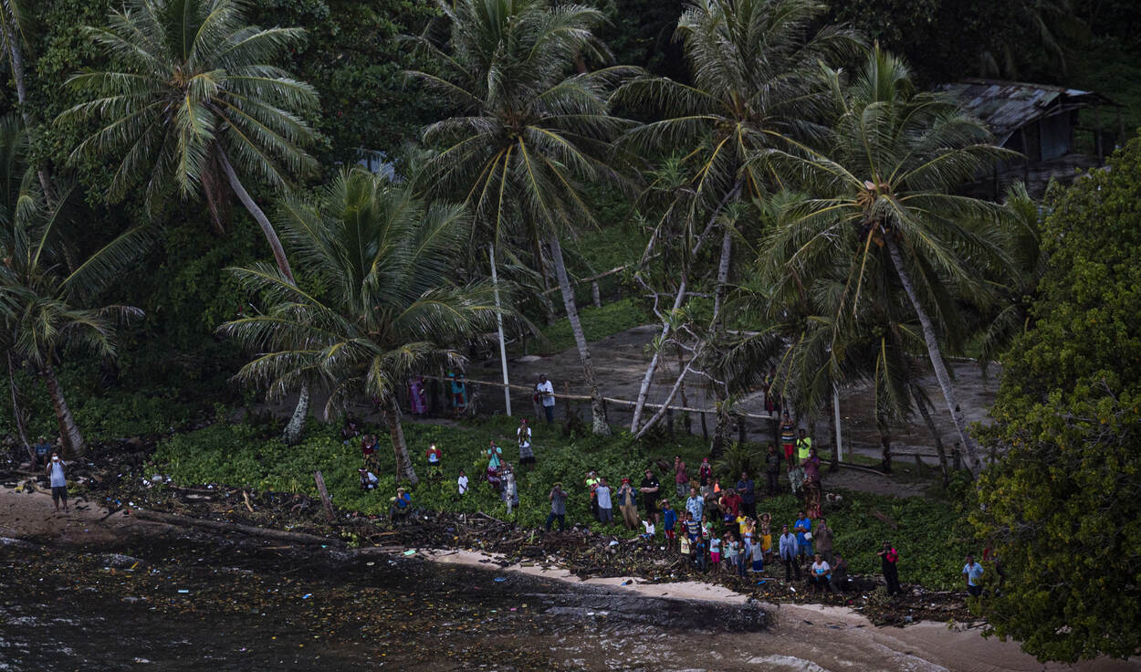 Vol verwachting kijken de bewoners van atoll ‘Pakin’ naar boven, als een Hercules een kostbare lading dropt. Foto: Staff Sergeant Devin M. Rumbaugh.