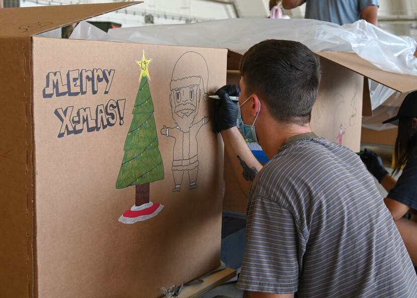 Een vrijwilliger versiert een doos met goederen die hij net heeft ingepakt. Foto: Senior Airman Aubree Owens.