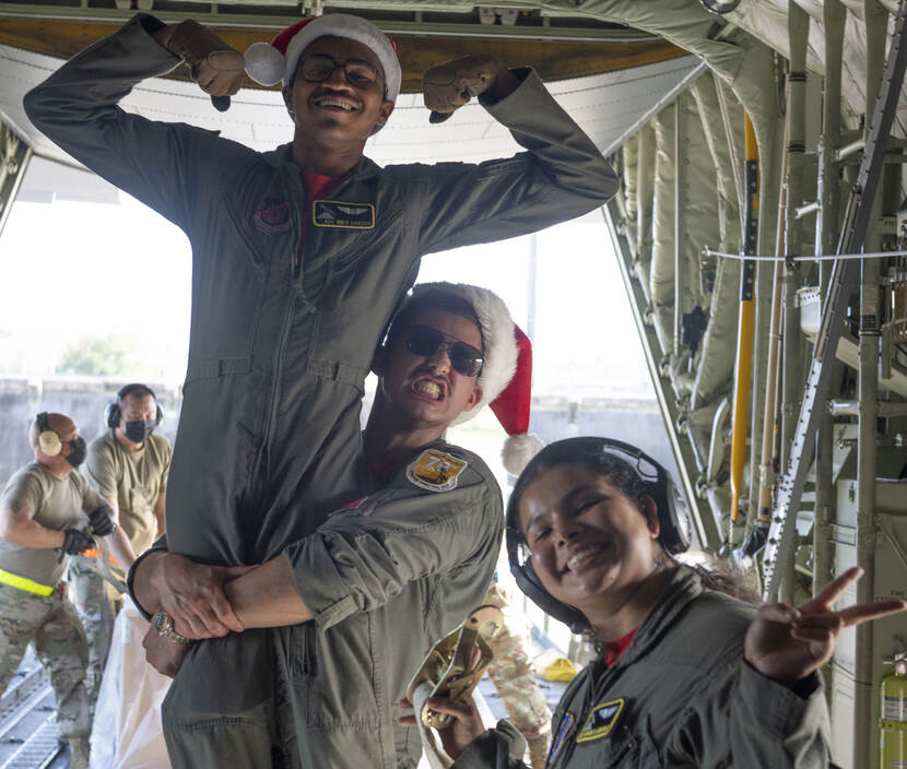 ‘Mission accomplished’. Loadmasters Milo Carter (links) en Gabriela Arnspiger (rechts) en vlieger Stephen Sharp (midden) vieren na de landing op Anderson Air Force Base dat hun kerstmissie is voltooid. Foto: Technical Sergeant Joshua Edwards.