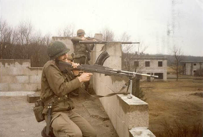 Dick van Velden stuurde deze foto uit 1986 waarop hij als reservist bij de Nationale Reserve (Natres) in oefendorp Oostdorp een mitrailleur Bren hanteert.