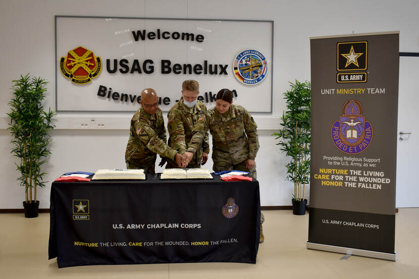 Libby Weiler knipte drie aalmoezeniers die onlangs ter gelegenheid van hun gezamenlijke verjaardag de taart aansneden. De chaplains maken deel uit van het U.S. Army Garrison, gestationeerd op Chièvres Air Base in België.