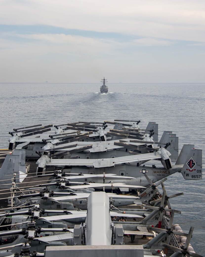 Petty Officer 2nd Class Brett McMimoway legde deze week aan boord van het amphibious assault ship USS Essex de passage door de straat van Malakka vast. Het schip op de achtergrond is de geleidewapen destroyer USS O’Kane. Beide schepen maken deel uit van de 11th Marine Expeditionary Unit die momenteel in het operatiegebied van de 7th Fleet patrouilleert.