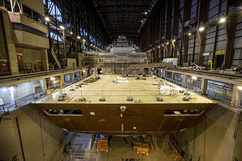 Sergeant-majoor Maartje Roos schoot dit beeld van Zr.Ms. De Ruyter, die momenteel in de Helderse Nieuwe Haven groot onderhoud krijgt. Het luchtverdedigings- en commandofregat (LCF) is volgens de planning in het eerste kwartaal van dit jaar klaar om weer te gaan varen. Daarna komt zusterschip Zr.Ms. Evertsen aan de beurt. Zodra ook deze klus is geklaard zijn alle vier LCF’s beter in waar het bij deze klasse om draait: nog sneller ballistische raketten uit de lucht plukken.