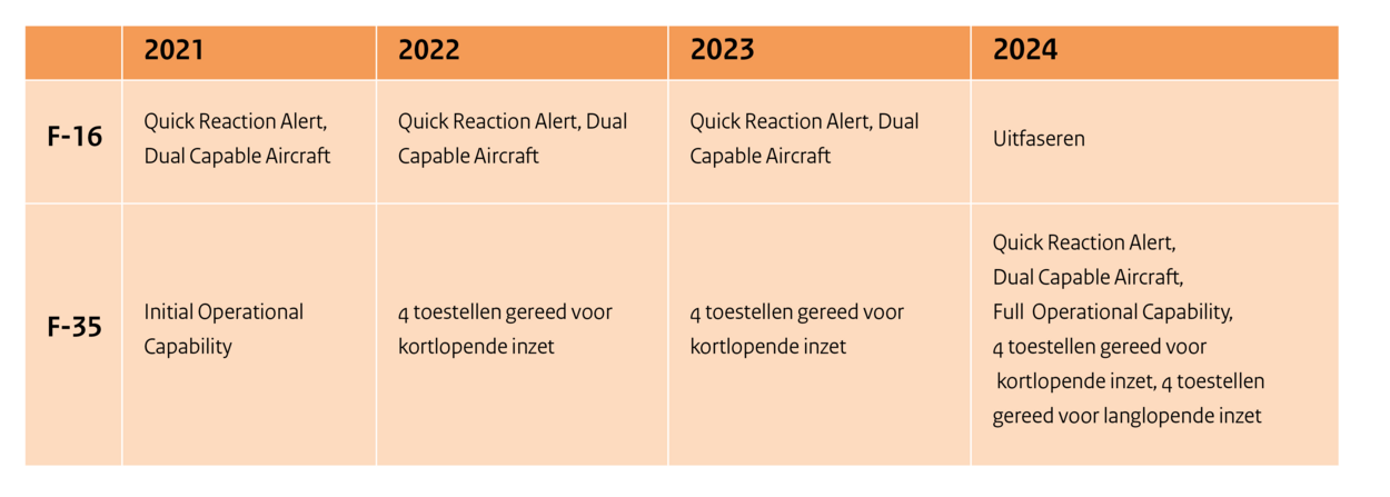 Volgens het huidige schema zijn de F-35 squadrons van de luchtmacht in 2024 volledig operationeel inzetbaar (Full Operational Capability). In dat jaar neemt de luchtmacht definitief afscheid van de F-16 die dan in eigen land alleen nog maar bewonderd kan worden in het Nationaal Militair Museum in Soest. In het buitenland zal het vliegtuigtype waarschijnlijk nog jaren blijven vliegen.