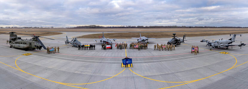 De NAVO is paraat! De Russische aanval op Oekraïne leidt ertoe dat het bondgenootschap zich voorbereidt op alle eventualiteiten. Dat is vooral te merken in Oost-Europa. In Litouwen maakte een onbekende NAVO-fotograaf deze foto van vliegtuigen en helikopters uit Groot-Brittannië, de Verenigde Staten en Litouwen en hun bemanningen. Samen sterk voor de verdediging van de lidstaten en alles waar ze voor staan.