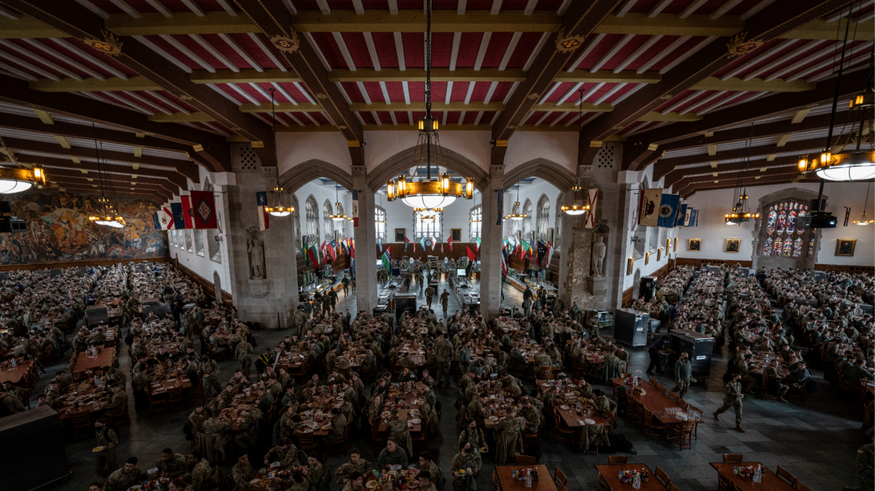 Een eetzaal die overigens niet onder doet voor ‘De Grote Zaal’ uit de filmreeks Harry Potter. Driemaal daags nuttigen ruim vierduizend cadetten hier hun maaltijd. Een soort fabriek, waar het werk dag en nacht doorgaat.