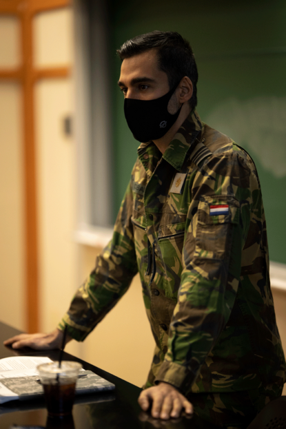 Dus denk maar niet dat er één cadet is die onderuitgezakt in de les zit. Laptops staan op tafel, telefoons ernaast, maar niemand die iets anders doet dan opletten. Er wordt nog geen Whatsappje gestuurd. Ergens wel logisch, want de gevolgen voor ‘uit de pas lopen’ zijn groot. Eén minuut te laat heeft al consequenties.