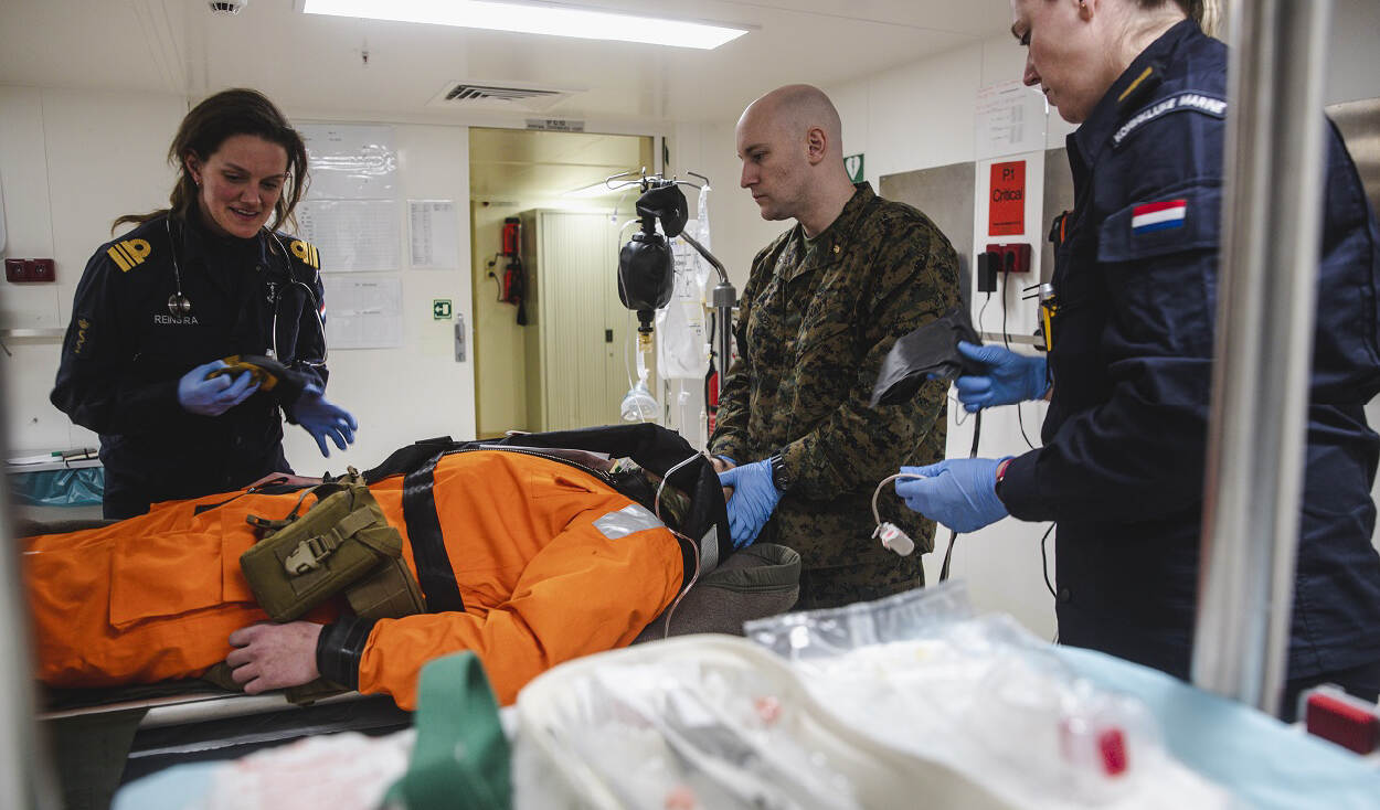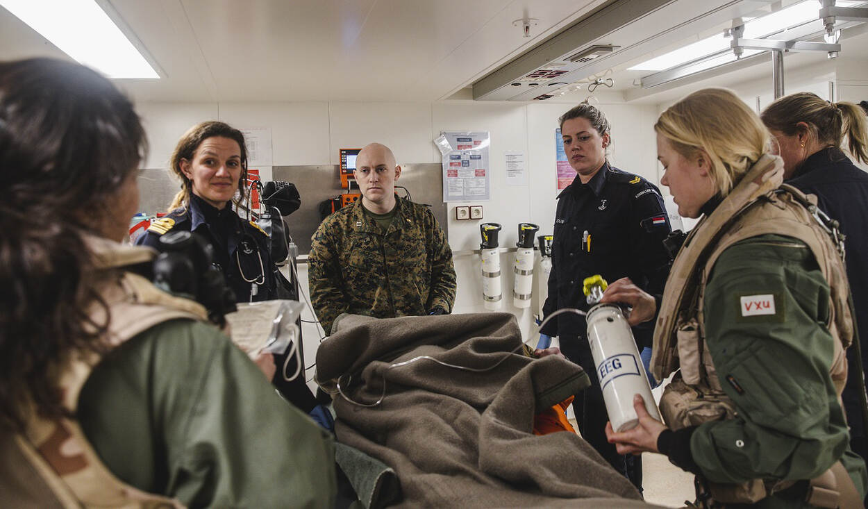 Deze ‘casualty drill’ werd deze week beoefend aan boord van de Rotterdam, samen met 300 Squadron en Amerikaanse mariniers van 3rd Battalion 6th Marine Regiment. Het werk van de Nederlandse Elza, Gracia, Vera, Jeffrey en Jasper en hun Amerikaanse collega’s Severiano, Benjamin en Conner resulteerde in mooi beeldmateriaal van fotografe Lance Corporal Jacqueline C. Arre van het U.S. Marine Corps.