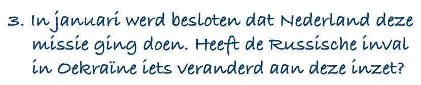 “Er is geen actieve dreiging dat ons personeel of materieel iets wordt aangedaan, maar we hebben wel te maken met grote cyberdreigingen. Iedereen heeft een telefoon gekregen die na deze uitzending vernietigd wordt. Privételefoons liggen thuis. We zijn heel bewust bezig hoe we met informatie omgaan, in Nederland zijn hier voorlichtingen over gegeven. We zijn er nu extra scherp op.”