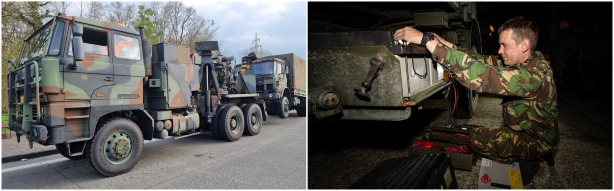 Dat de gloednieuwe Scania’s het redden tot aan Slowakije, daar bestaat weinig twijfel over. Maar de Viertonners uit de jaren tachtig zorgen onderweg, zoals verwacht, al snel voor uitdagingen. Een aantal valt op de eerste dag uit met problemen, andere hebben met enige regelmaat een flinke lik olie of serieuzer onderhoud nodig. Om te zorgen dat pech onderweg niet leidt tot onnodig veel oponthoud rijden er de hele rit twee ‘veegploegen’ mee. Bij mankementen maken zij direct op de vluchtstrook de afweging: is het mogelijk om het voertuig ter plekke te repareren of moet hij worden afgesleept? In het laatste geval wordt een voertuig op de Rest Over Nights (RON) overgedragen aan sergeant-1 Yordie en zijn collega’s van 133 Herstelpeloton. Vanavond is het ‘slachtoffer’ een viertonner met een vermoedelijk accuprobleem. “Het zijn lange dagen”, erkent Yordie. “Maar ach, dat hoort bij het werk. De dankbaarheid van de chauffeurs de volgende dag maakt een hoop goed.”