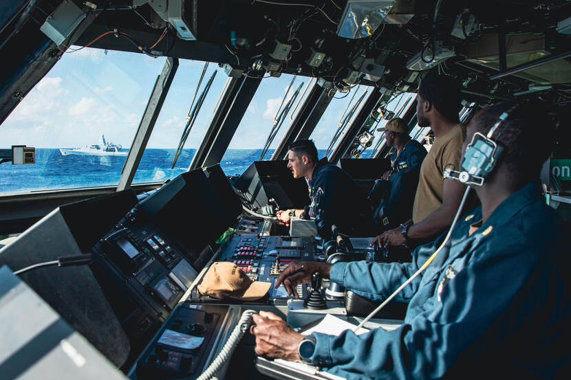 Een foto vanaf de brug van het Amerikaanse oorlogsschip USS Billings. Een wirwar van knopjes, hendeltjes en metertjes. Slechts één van de vier bemanningsleden let op het bedieningspaneel, de anderen kijken naar Zr.Ms. Friesland van onze marine. De Nederlandse bemanning onderschepte de afgelopen periode liefst 1.900 kilo drugs bij drie acties in het Caribisch gebied.