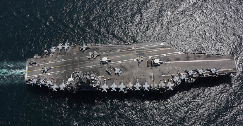Fotograaf MCS Aleksandr Freutel van de Amerikaanse marine vloog vorige week mee met een helikopter in de Japanse Zee pal boven het vliegkampschip USS Abraham Lincoln en maakte deze bijzondere foto. De reusachtige carrier lijkt van deze hoogte wel een plastic modelletje en de vliegtuigen en helikopters aan boord komen zo te zien ook uit de modelbouwwinkel. Al geteld hoeveel er aan boord staan en van welk type ze zijn?