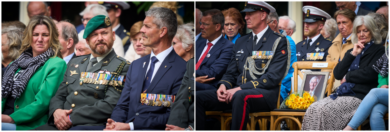 Onder de aanwezigen Ridder Militaire Willemsorde majoor Marco Kroon en mr. Pieter van Vollenhoven. Een speciale plek was ingericht voor de vorig jaar overleden Britse Ridder MWO majoor Ken Mayhew, wiens foto op de stoel stond naast zijn weduwe Trish.