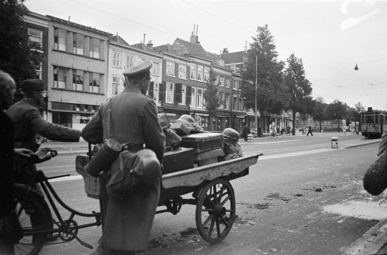 Het is Dolle Dinsdag. De dag waarop berichten ons land bereiken dat de bevrijding nabij zou zijn en de Duitsers in ons land massaal op de vlucht slaan. Hun haastige vertrek, zoals hier in Den Haag, brengt hoop bij de bevolking op een spoedige bevrijding. Maar schijn bedriegt; de Duitsers hergroeperen zich en nemen de touwtjes weer stevig in handen. Er wacht voor een deel van Nederland nog een loodzwaar laatste oorlogsjaar. Foto: Menno Huizinga, collectie NIOD.