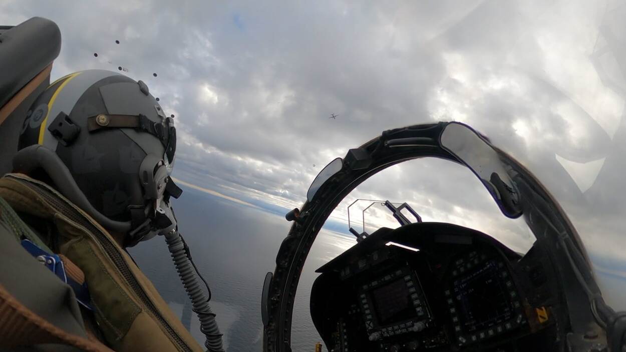 Spreekt u geen Spaans? 'Te tengo' betekent zo veel als 'hebbes'. En dat is wat de Spaanse jachtvlieger gedacht zal hebben toen hij het Russische AN-12 transportvliegtuig in de verte onderschepte. De NAVO liet vorige week weten dat vliegtuigen van het bondgenootschap verschillende keren naar Russische vliegtuigen waren gestuurd bij de Baltische Staten of in het gebied van de Zwarte Zee. Foto: Spaanse luchtmacht.